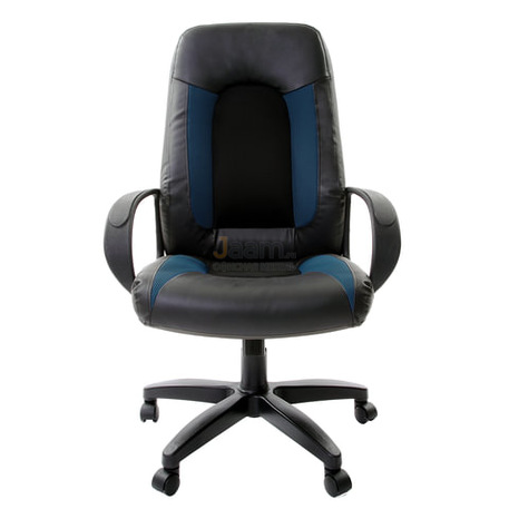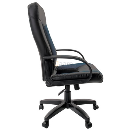 Кресло для руководителя Strike EX-525 экокожа черное/синее, ткань серая TW №44694 - высота спинки: 71 см, ширина спинки: 54 см, механизм качания без фиксации, регулировка жесткости качания по весу сидящего, ограничения по весу: 120 кг, основание: пластик, каркас: немонолитный, производитель: россия и снг, подлокотники, регулировка по высоте, в наличии в Ярославле.